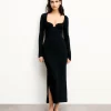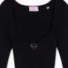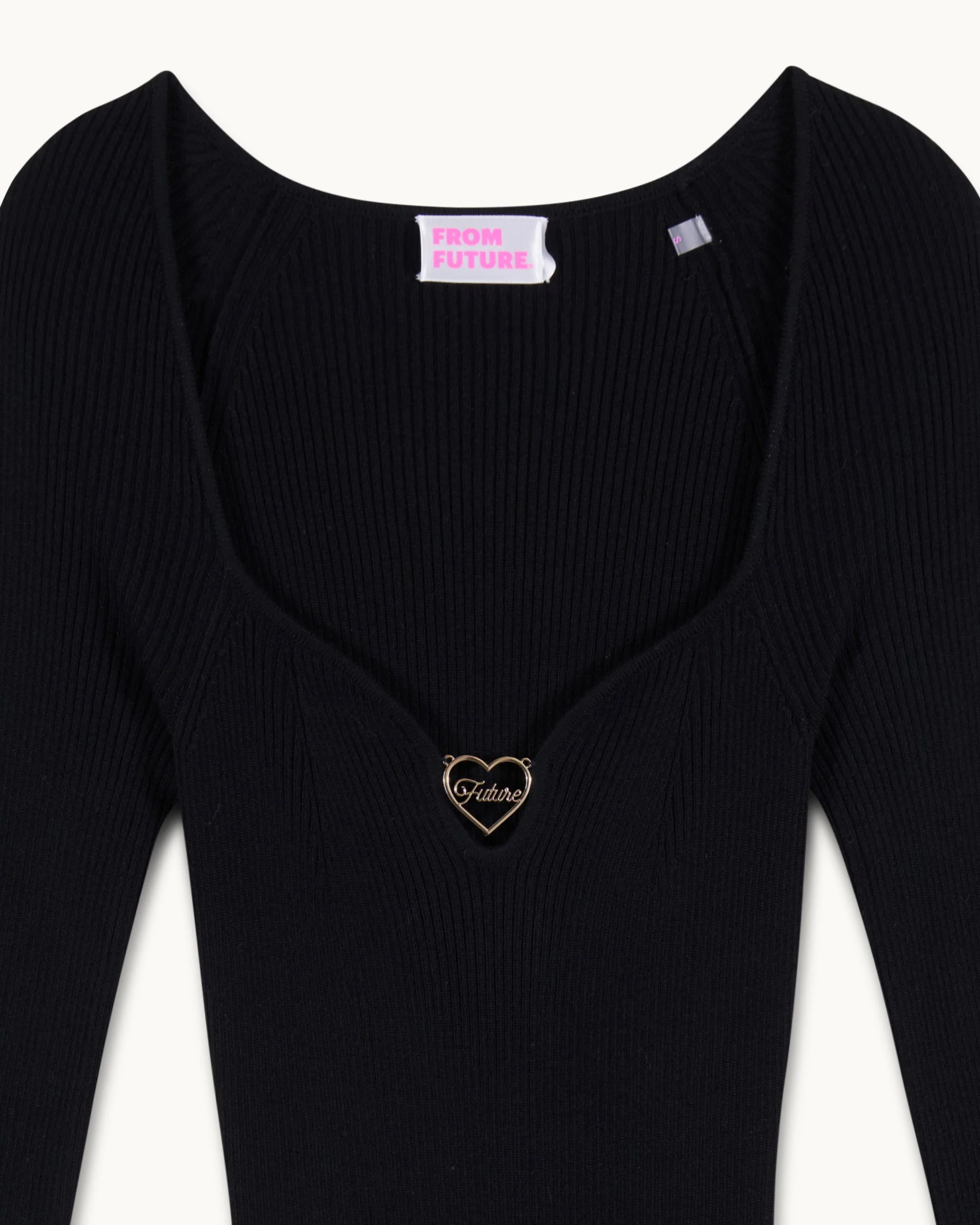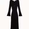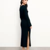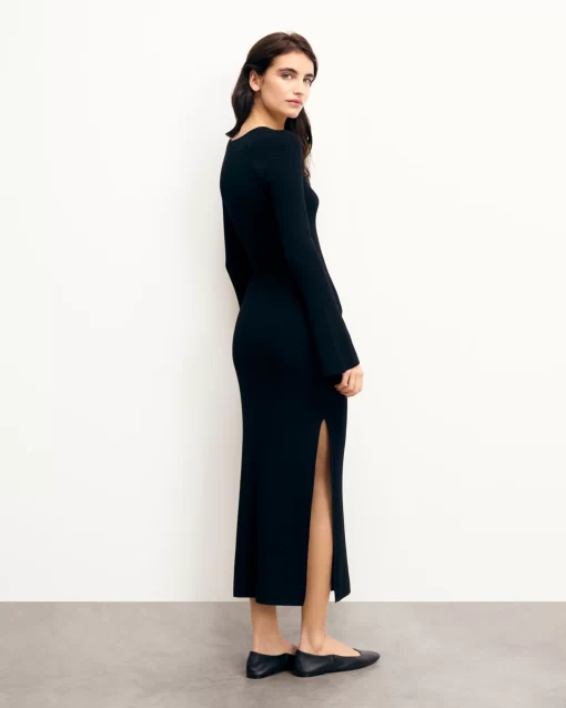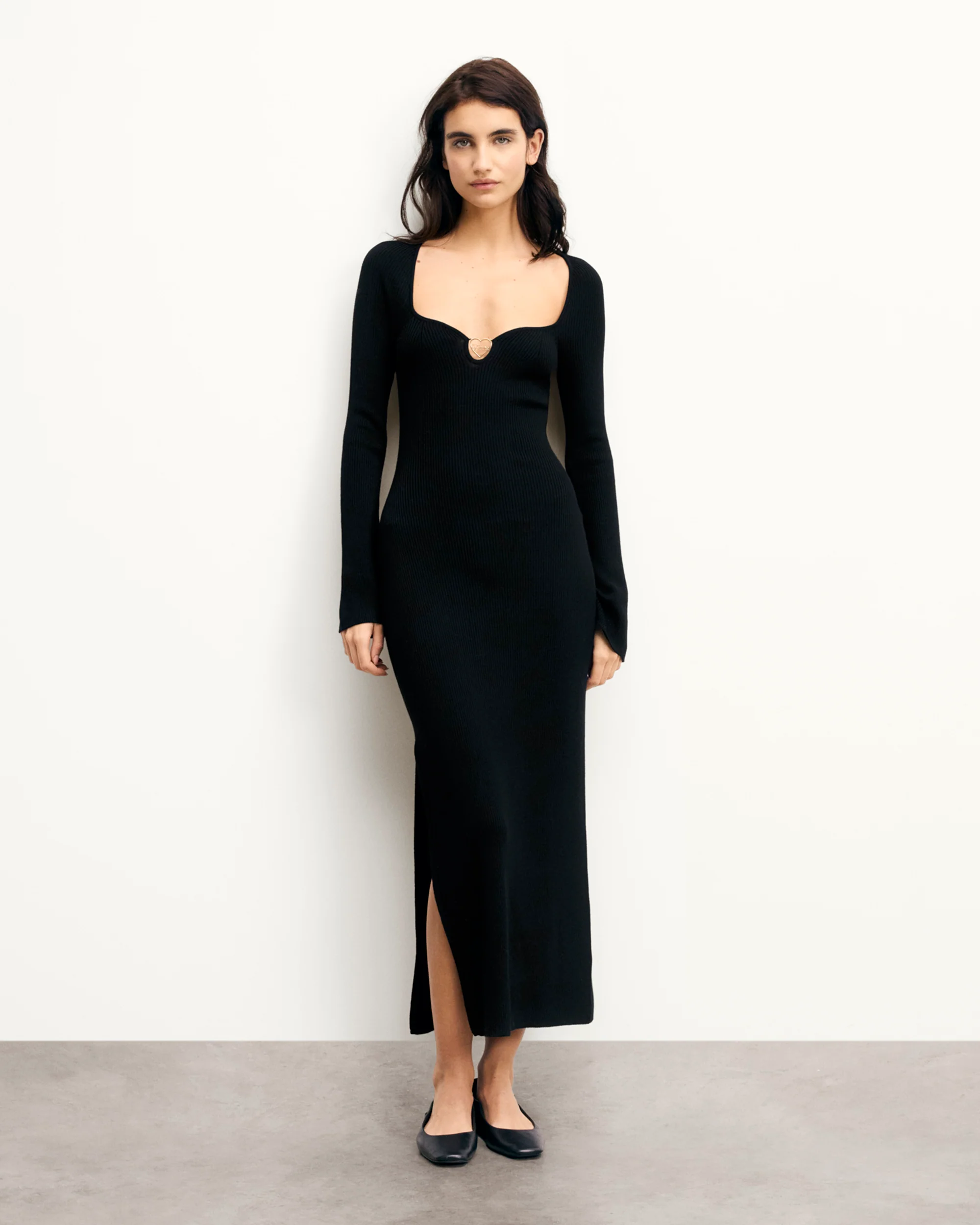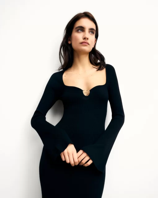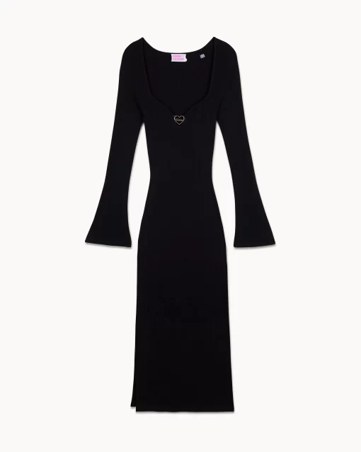 A versatile and elegant piece, perfect for both day and night. This long 4-ply merino wool dress features a daring neckline adorned with a cutout and heart-shaped jewel. Flared cuffs and a slit skirt create a striking silhouette. A versatile and elegant piece, perfect for both day and night.
