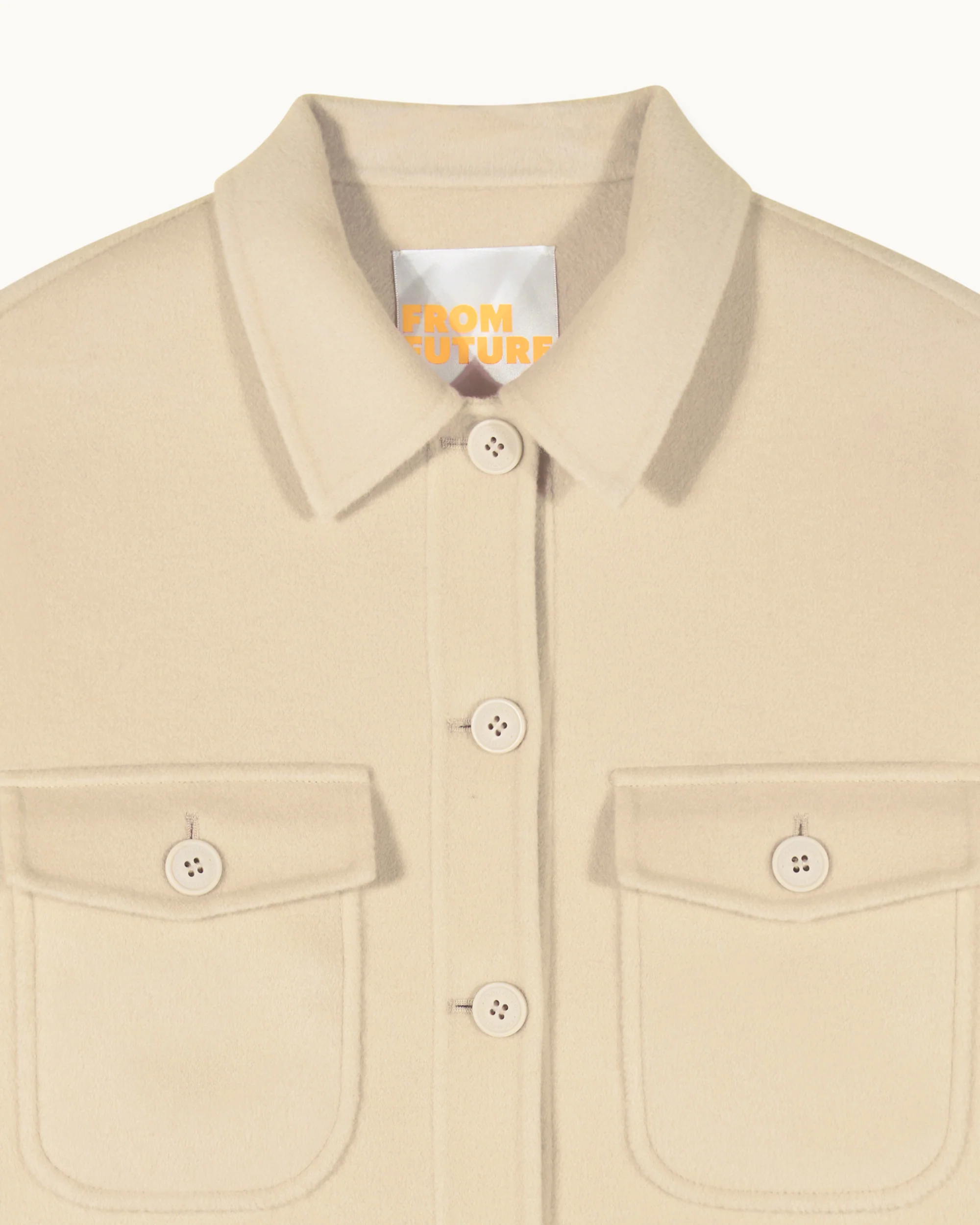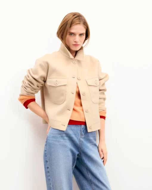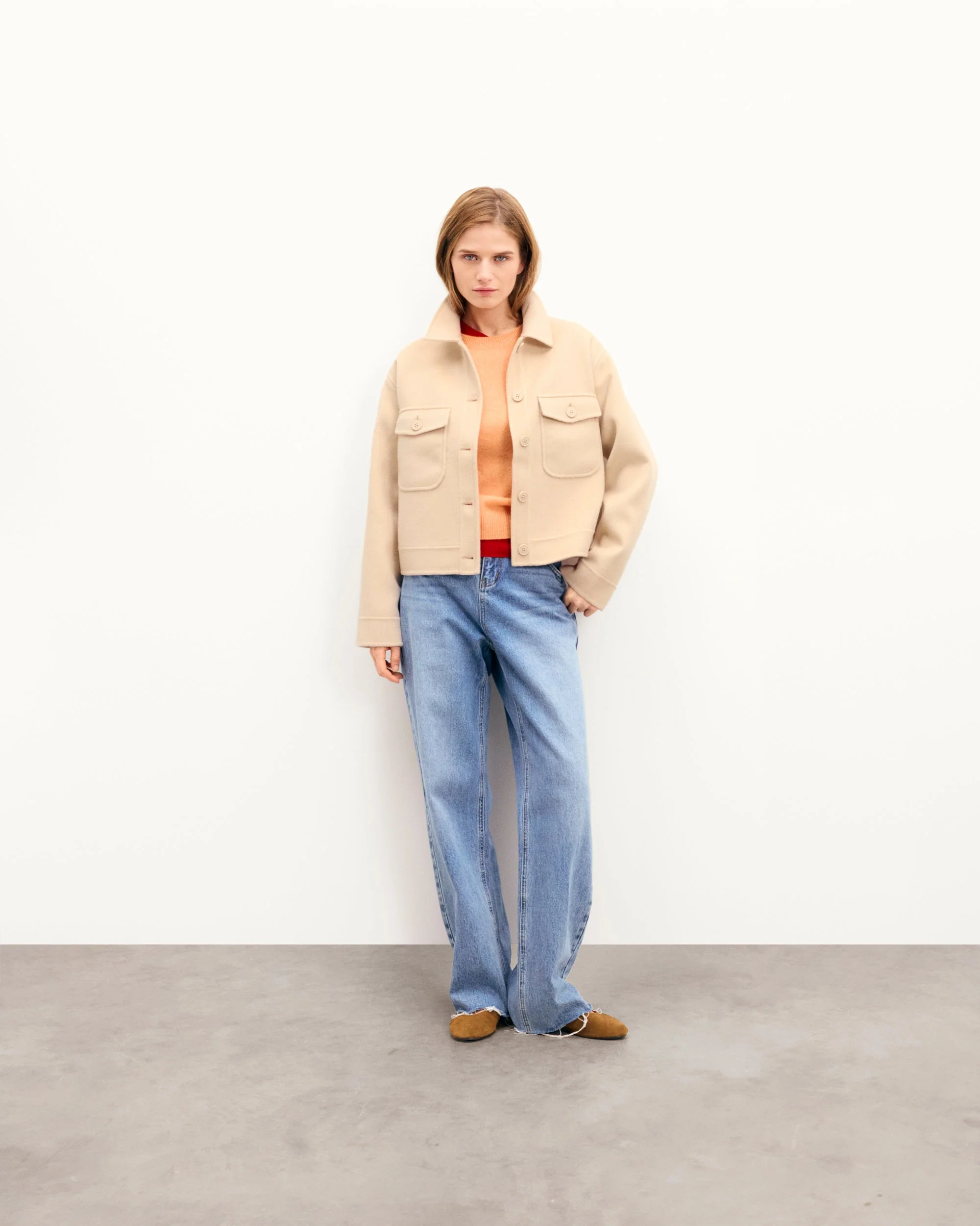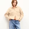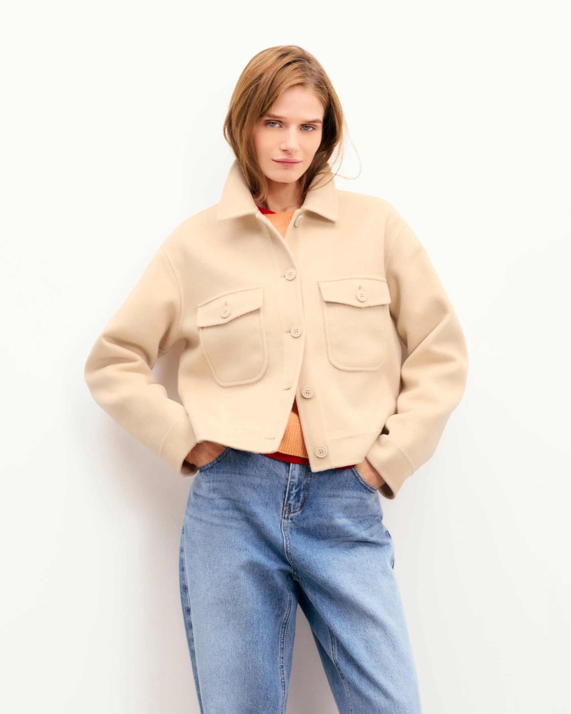 Cozy up in this structured wool jacket. It features a shirt neck, button closure, and two flap pockets for a timeless look. Perfect for layering over your favorite jeans or a dress.