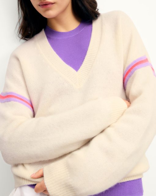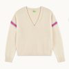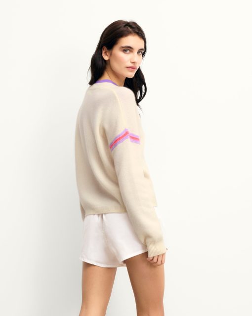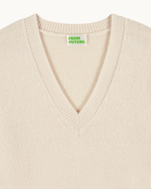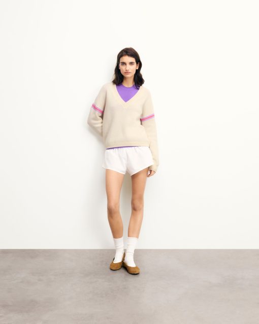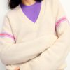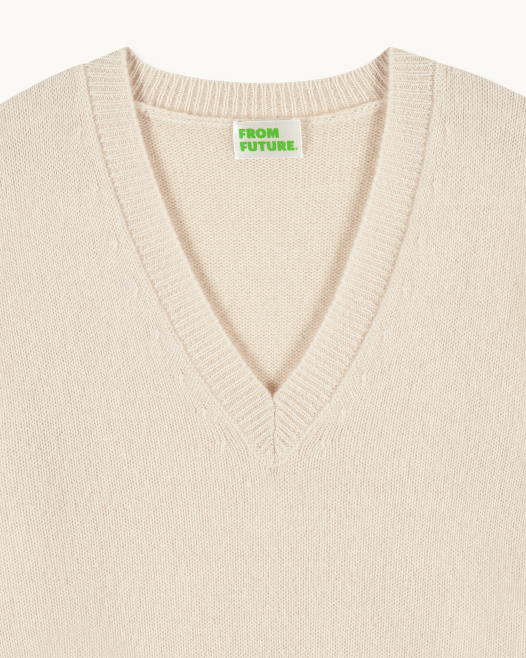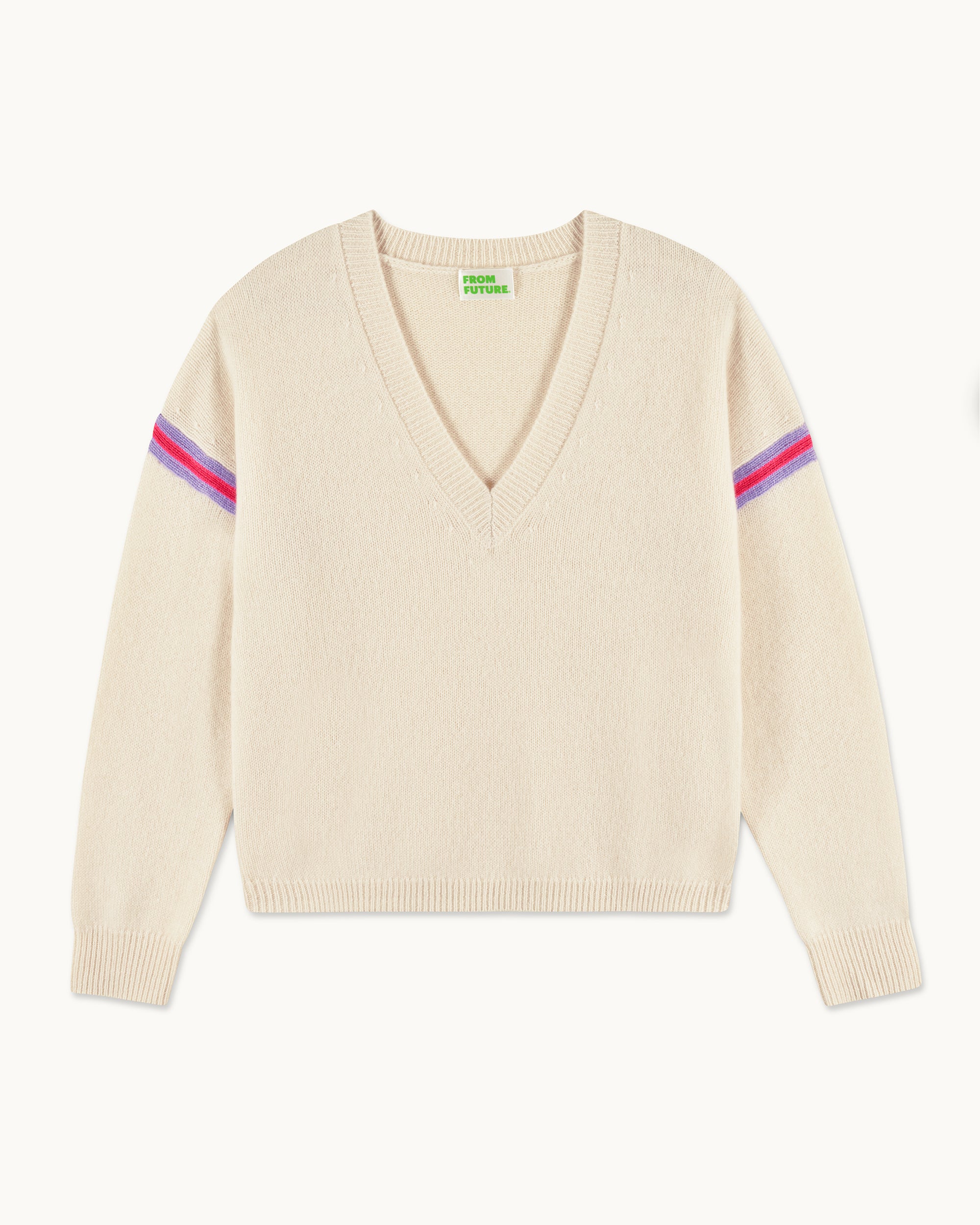 A From Future’s wardrobe essential. This cropped 4-ply cashmere sweater is adorned with two-tone bands on the sleeves. A V-neck and ribbed edges complete the look. Pair it with a flowing skirt or tailored pants.